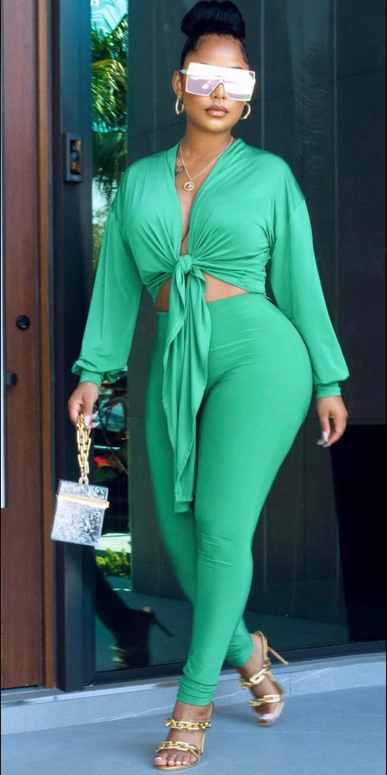 Green two-piece features long sleeves, a front wrap style, a v-neckline, and elasticized waist pants. Crop top ties at the middle--has deep plunge line.